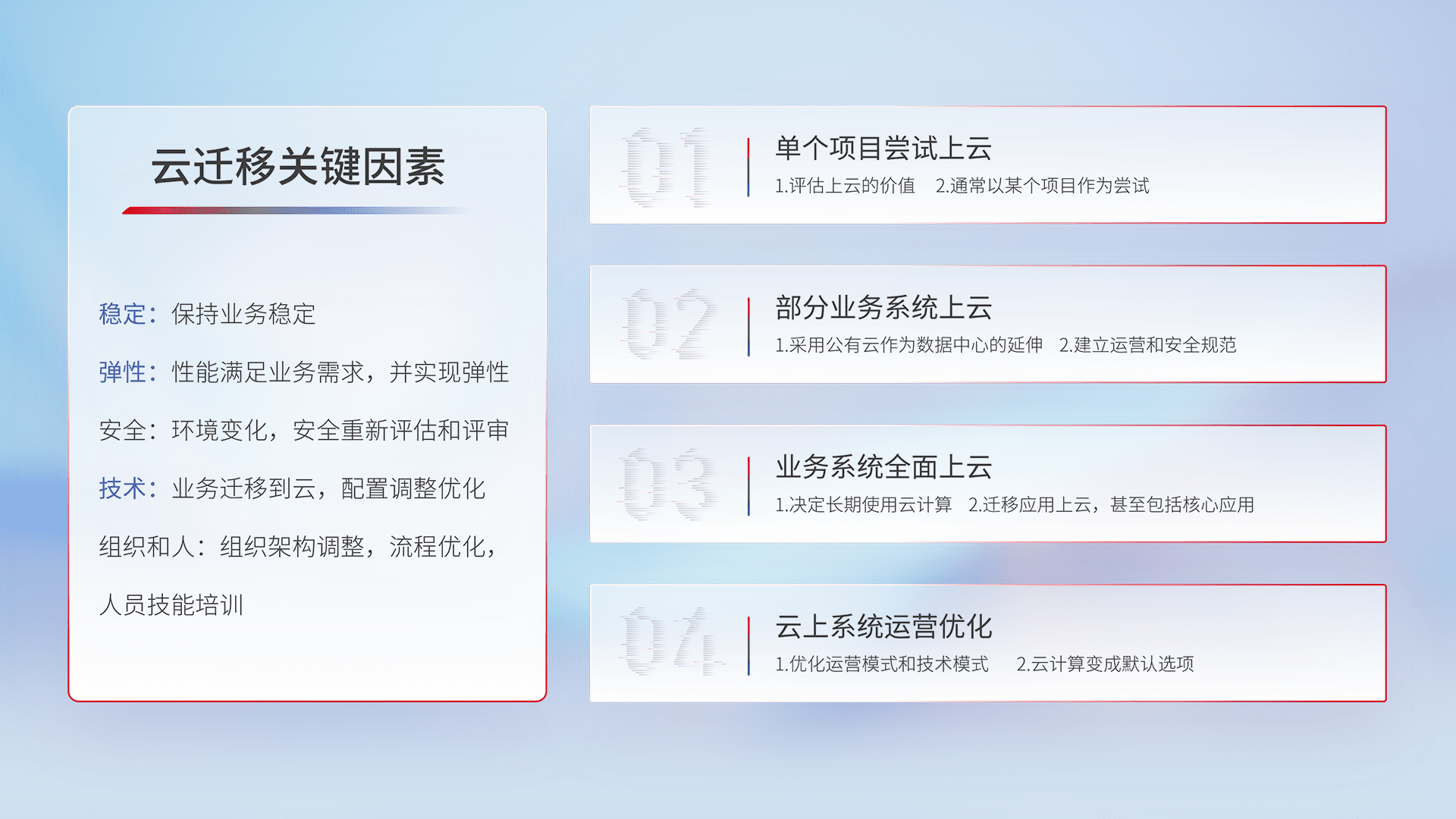 结合实际业务,,,,从规划设计、、、、云平台选型、、云原生改造、、、、数据迁移、、集成交付,,,,迁移全过程为客户识别最佳上云路径,,做好风险识别管理,,,设计网络架构、、、、身份权限、、、、安全审计合规、、操作审计、、日志审计、、、、监控告警策略、、多站点容灾设计等,,,,对云上基础设施进行整体规划,,,提升IT治理水平,,,以满足弹性、、、高可用、、高性能的需求。。。。