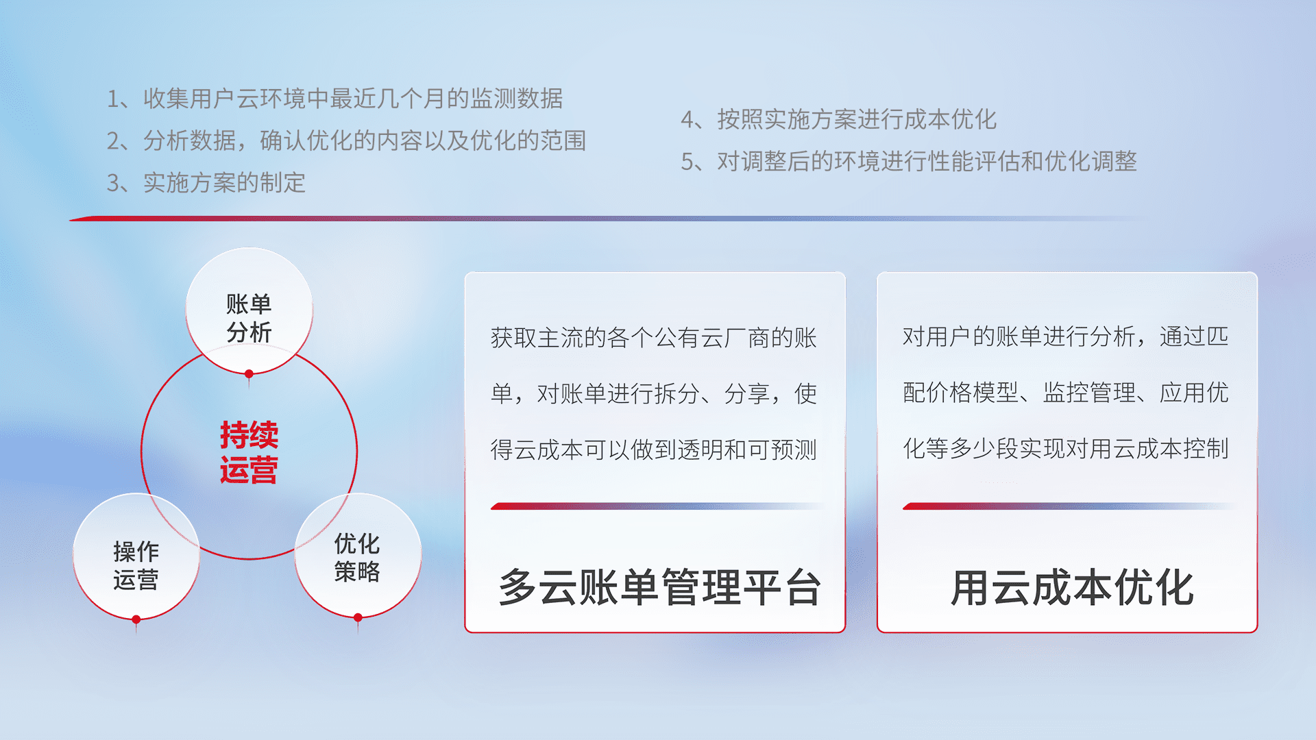 通过多云纳管,,,以统一的资源数据模型把客户的云资源进行抽象和封装,,,进而实现对多云资源的统一操作,,保障云资源管理的可靠性、、、、稳定性与可用性。。。量身定制化运维内容,,,配置、、开发运维、、、、补丁管理、、、备份、、、监控、、、、认证和访问管理、、、审计和日常巡检等,,保障在用云过程中的可靠度,,稳定度以及高可用率。。。。